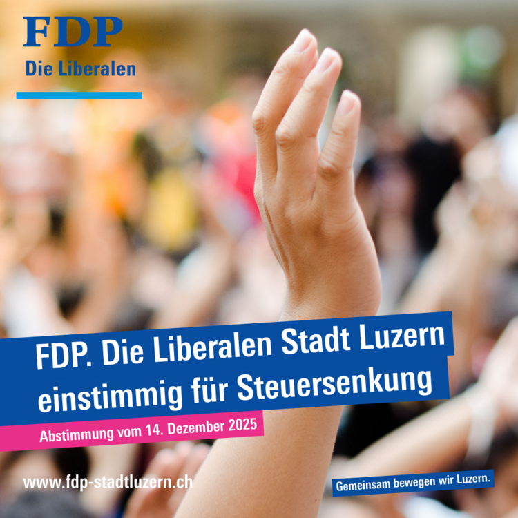 Mit einstimmiger Parole haben die Mitglieder der FDP.Die Liberalen Stadt Luzern nun die Ja-Parole zum Budget 2026 und damit auch ein Ja zur vorgesehenen Steuersenkung beschlossen. Für die FDP.Die Liberalen ist klar: Angesichts der wiederkehrenden Überschüsse ist eine Steuersenkung nicht nur vertretbar, sondern notwendig. Die Stadt Luzern soll wirtschaftlich stark bleiben – und zugleich steuerlich fair gegenüber ihren Einwohnerinnen und Einwohnern sein. Haushaltsdisziplin und Steuersenkungen gehören untrennbar zusammen. Präsident Moritz Falck dazu: «Ich freue mich über die klare Parole unserer Mitglieder zum Budget 2026. Dieses Ergebnis zeigt, dass wir als Partei Verantwortung übernehmen und konsequent für eine nachhaltige, aber auch bürgernahe Finanzpolitik einstehen. Wir wollen eine Stadt, die wirtschaftlich attraktiv bleibt, Spielraum für Investitionen bewahrt und ihre Bürgerinnen und Bürger nicht stärker belastet, als nötig.